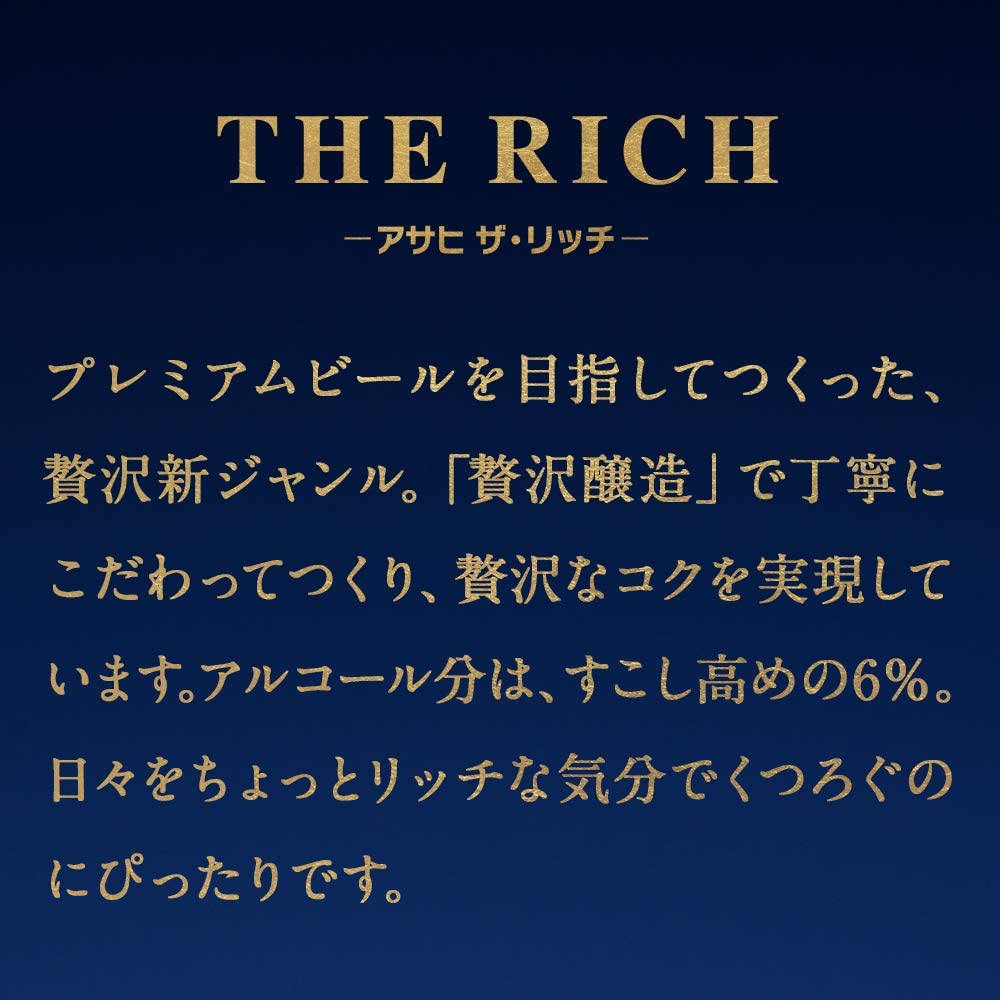 プレミアムビールを目指してつくった、贅沢新ジャンルです。贅沢醸造で丁寧にこだわってつくり、贅沢なコクを実現しています。アルコール分は、すこし高めの6%です。さまざまな食事に合うのは、もちろんのこと、日々をちょっとリッチな気分でくつろぐのにふさわしい商品となっています。