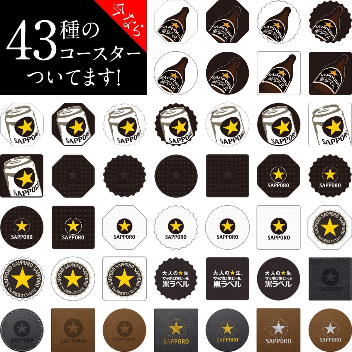 サッポロ独自の「旨さ長持ち麦芽」を新採用。今までの「麦のうまみと爽やかな後味のベストバランス」はそのままに、これまで以上に「生ビールのひと口目のうまさ」を長く楽しめるようになりました。とことん旨さにこだわった「大人の生」です。黒ラベルデザインの特製ラバーコースター付き。全35種類のうち4種類が入っています。